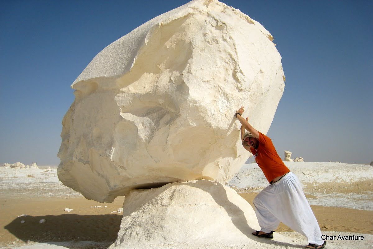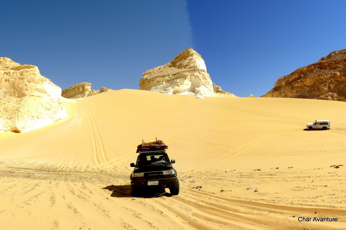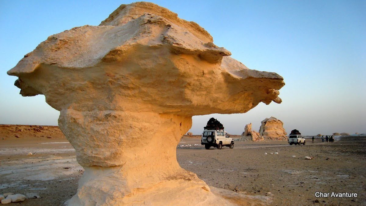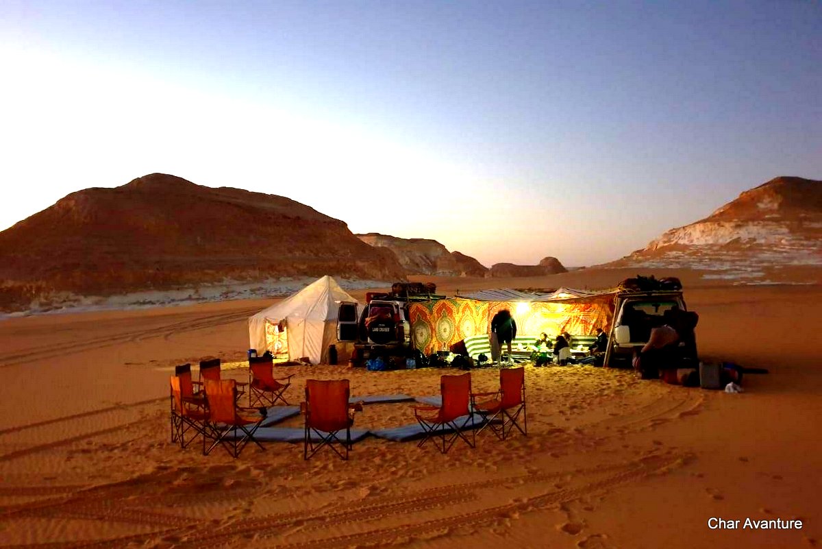 Nadaljevali bomo z razburljivim safari izletom z džipi 4×4 po črni puščavi. Vožnja nas bo popeljala mimo kristalnih gora, gorskih jam, sipin, starih vasic in tolmunov. Pot bomo nadaljevali proti beli puščavi, kjer bomo preživeli noč v puščavskem kampu pod milijoni zvezdami. Ob večerih nas bodo očarali ogenj, bobni, šiša in petje.